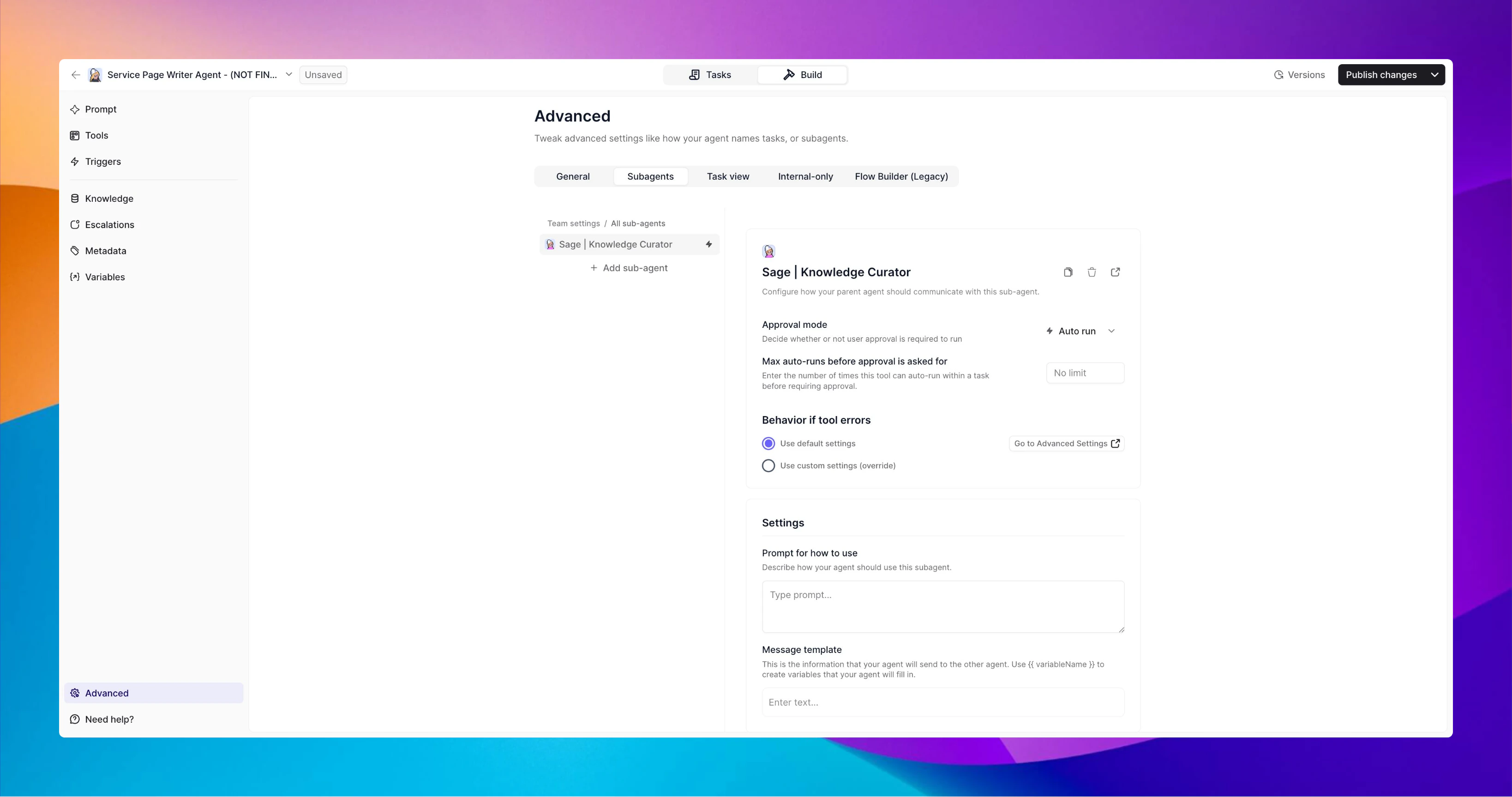 • Use Custom Settings: Create specific error handling instructions just for this Sub-agent
